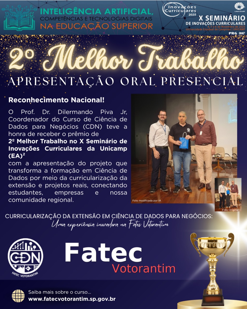 O trabalho premiado, intitulado “Curricularização da Extensão em Ciência de Dados para Negócios: Uma Experiência Inovadora na Fatec Votorantim”, foi apresentado pelo Prof. Dr. Dilermando Piva Junior, coordenador do curso de Ciência de Dados para Negócios.